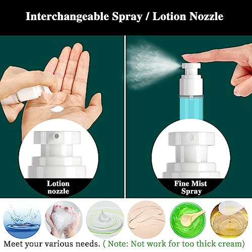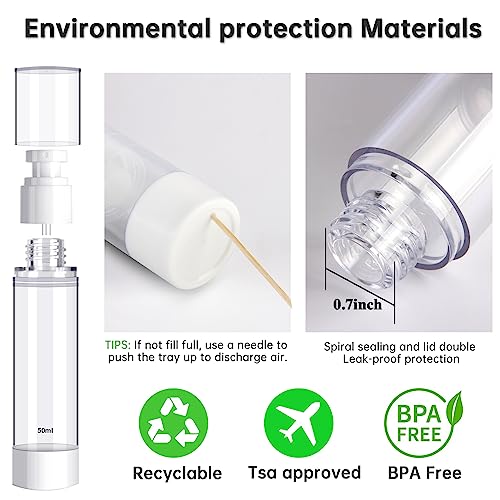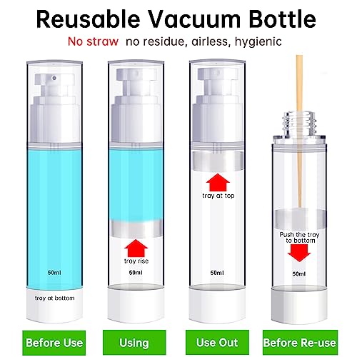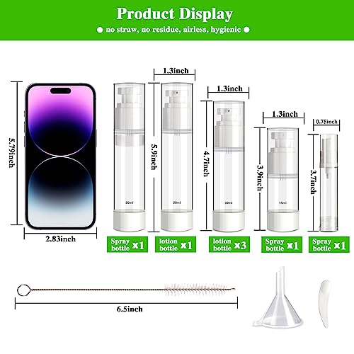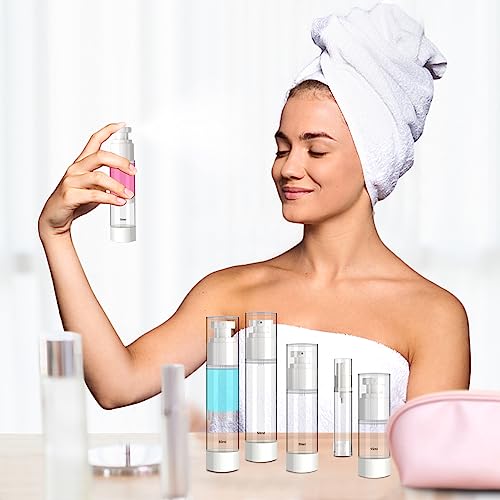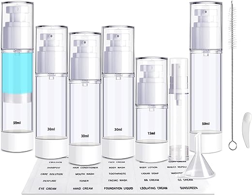 • 【 MUST-HAVE Travel Set 】 You will get 7 empty airless pump bottles in 4 sizes (50ml/1.7oz, 30ml/1oz, 15ml/0.5oz, 10ml/0.34oz) with interchangeable Spray nozzles and lotion nozzles. Bonus accessories funnels, scoopers, name tag labels, cleaning brush, and ziplock bag.